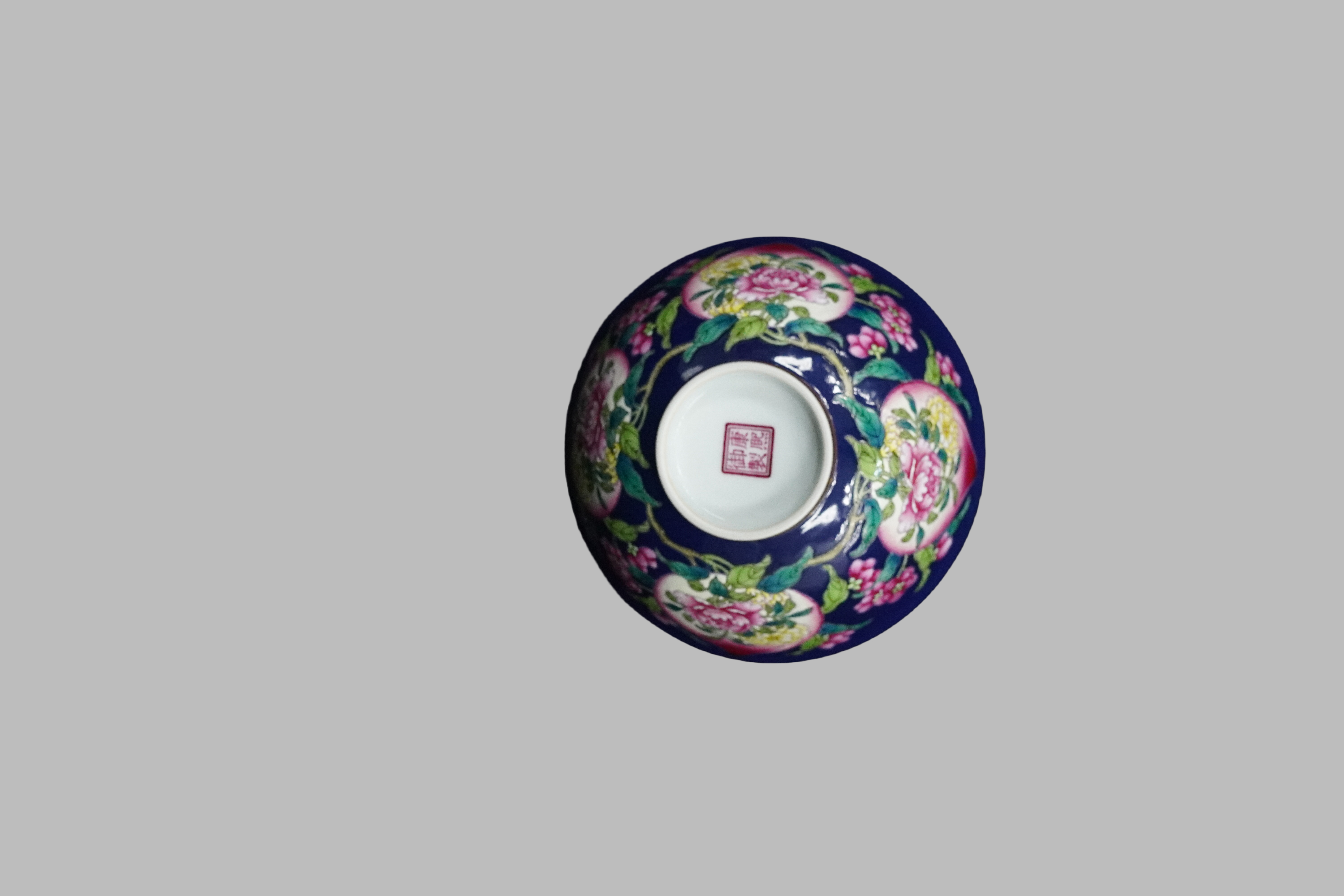 匀,被称为“宝石蓝”,是清代早期官窑的标志性釉色之一。康熙祭蓝地五彩碗的纹饰仍以“福寿纹”(寿桃、牡丹、花卉)为主,寓意“福寿双全、富贵吉祥”,但纹饰风格更“古拙刚劲”。祭蓝釉与粉彩的工艺结合,体现了清代中期“色彩对比、工艺复合”的审美追求,蓝地的沉稳与粉彩的艳丽形成强烈视觉冲击,是清代彩瓷艺术的代表之一。