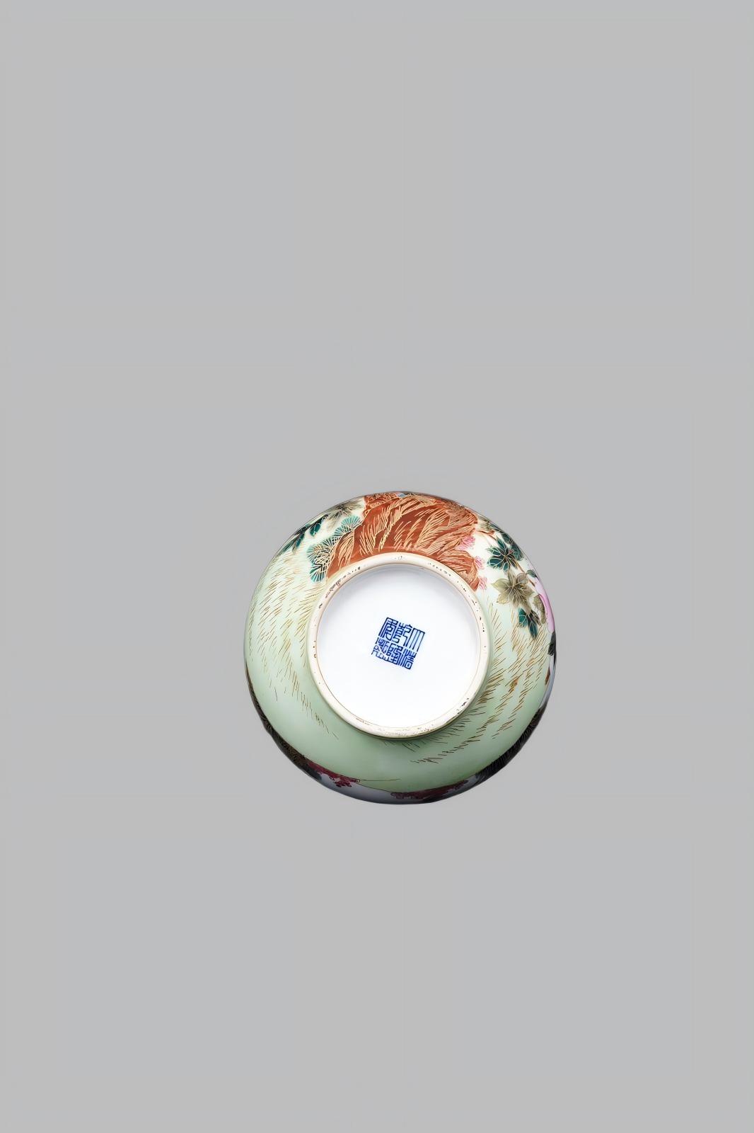 主纹饰:瓶身绘青松、仙鹤、祥云、寿桃一一 松象征“长寿常青”,鹤是“祥瑞之鸟”,寿桃寓意"福寿绵长”,整体组合是“松鹤延年、福寿双全”的经典祝福,是清代万寿节(皇帝生日)常用纹饰。辅助纹饰:底部饰淡绿釉,与主纹的清雅色调呼应,暗含"生机盎然”的寓意。