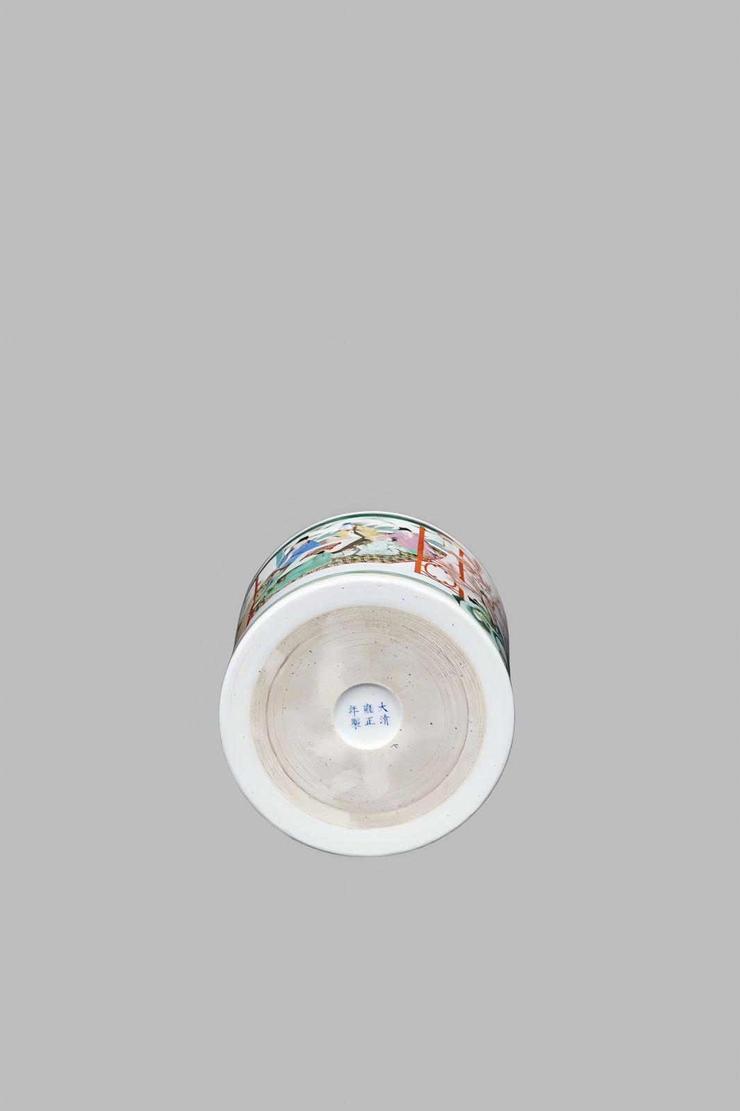 清代雍正时期的五彩(或粉彩)人物故事纹笔筒,是清代文房瓷中 "叙事性纹饰+实用价值”的经典品类,它属于清代文房青花/彩瓷。是清代文房瓷精品,兼具“文房属性+工艺稀缺性”,收藏价值极高。作为“人物故事纹笔筒”,是清代文人文化与制瓷工艺结合的实物见证。