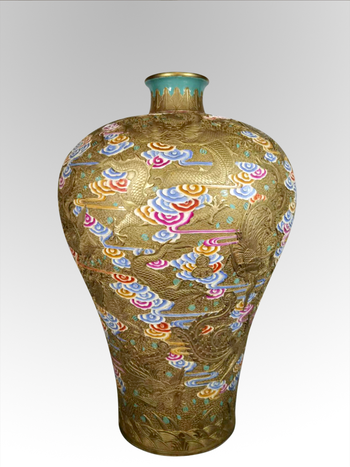 The body serves as a carved porcelain ground entirely covered in gilt, meticulously engraved with a dense and intricate brocade pattern. This complex yet orderly background provides a rich foundation for the main decorative motifs. Above this, dragons and phoenixes are depicted in relief: the dragons are rendered with powerful, sinuous bodies and clearly defined scales and claws, while the phoenixes display splendid plumage and dynamic postures. These mythical creatures soar amidst familie-rose clouds, which are shaded in soft gradients of pink, blue, red, and yellow, creating a vivid, multi-layered effect. The brilliance of the familie-rose clouds complements the metallic sheen of the gilt carved ground, resulting in a magnificently opulent visual presentation.