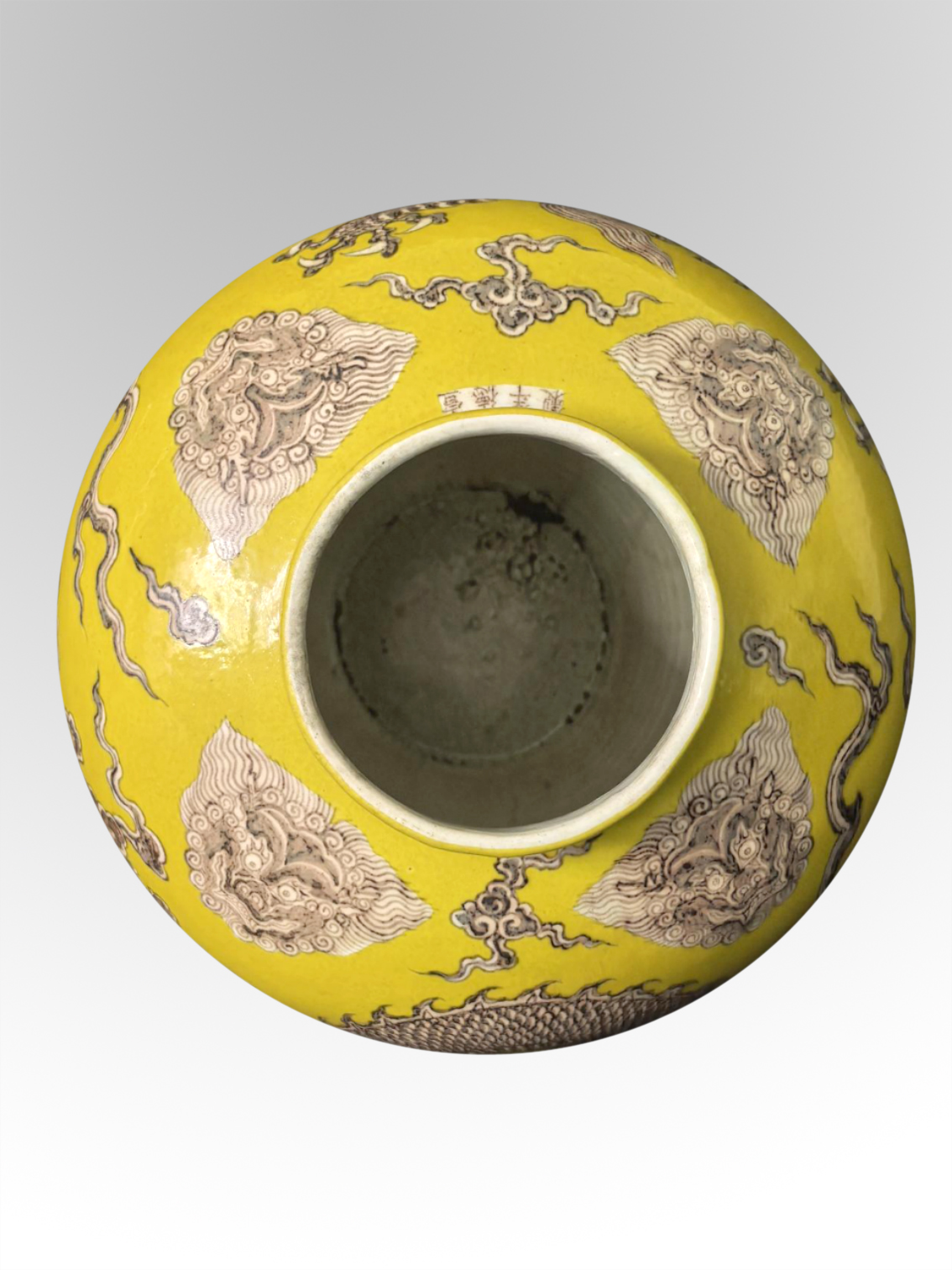 According to collection statistics, there are no more than 20 genuine large yellow-ground underglaze red dragon-patterned jars of the same type in the world. This large yellow-ground underglaze red dragon-patterned jar was purchased by Jincheng International Group from a senior collector in Beijing in July 2025. "Jingdezhen Tao Lu" (Record of Jingdezhen Ceramics) also records that for such porcelain, "not even one out of ten in a kiln can be successful". Large-sized wares like the large yellow-ground underglaze red cloud and dragon-patterned jar are also prone to deformation due to center-of-gravity issues, so those that have been completely passed down to the present day can be called "survivors".