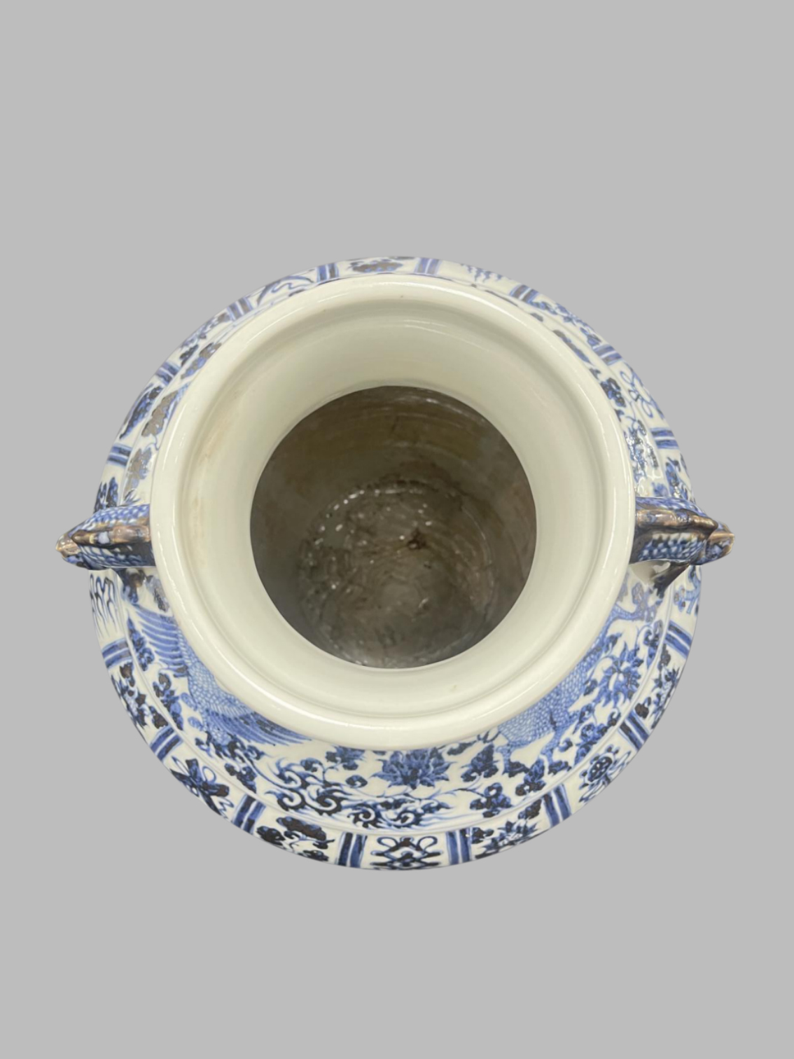 Brief introduction to the porcelain:the vessel has a thick and full shape, typical of large blue-and-white porcelain pieces from the Yuan Dynasty. The shoulders are adorned with three-dimensional fish-shaped double ears, which are vivid in form, echo the blue-and-white glaze color, and feature complex craftsmanship with strong visual appeal. The bottom is an unglazed sandy base, showing traces of spiral tire trimming, a signature feature of Yuan Dynasty artifacts.The body of the vessel is decorated with blue-and-white patterns in layers: the main patterns include intertwined peony patterns (known as the "king of flowers," symbolizing wealth, prosperity, auspiciousness and beauty), unicorns, and phoenixes (ancient auspicious beasts, representing good fortune and nobility). These are supplemented by patterns such as rolling sea waves, creeping grass, and geometric patterns. The decorative layers are clear, and the blue-and-white color is rich and bright, fully embodying the artistic style of Yuan Dynasty blue-and-white porcelain, which is "elaborately crafted yet well-arranged."