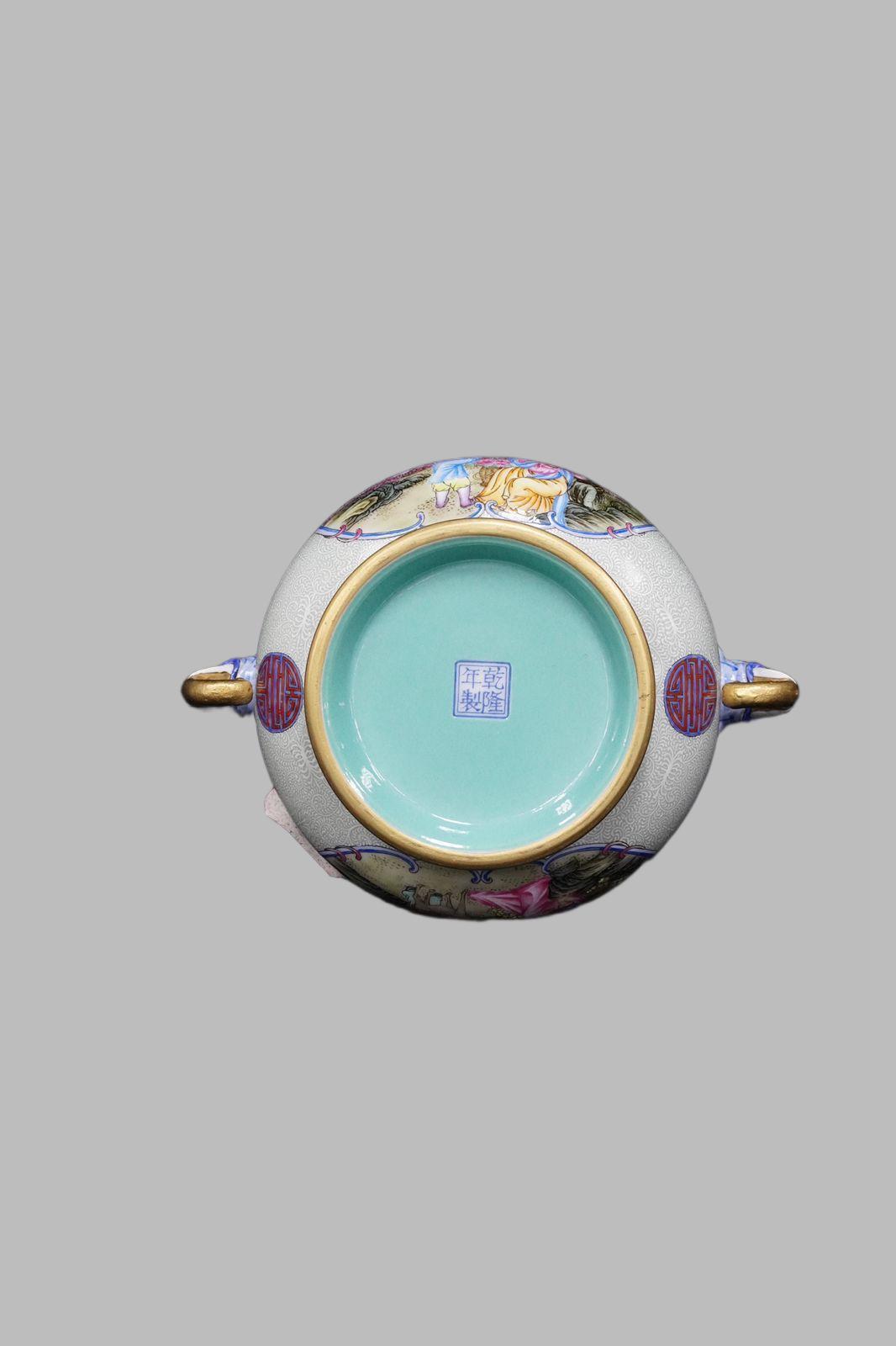This is a famille rose incense burner with elephant-shaped ears and reserved panels decorated with figure patterns from the Qianlong period of the Qing Dynasty, a representative of the "luxurious porcelain with composite craftsmanship" in the Qianlong era. The elephant-eared incense burner (equipped with a lid, a pair of elephant-shaped ears, and a ring foot) served as both a court display ornament and an incense utensil during the Qianlong reign.