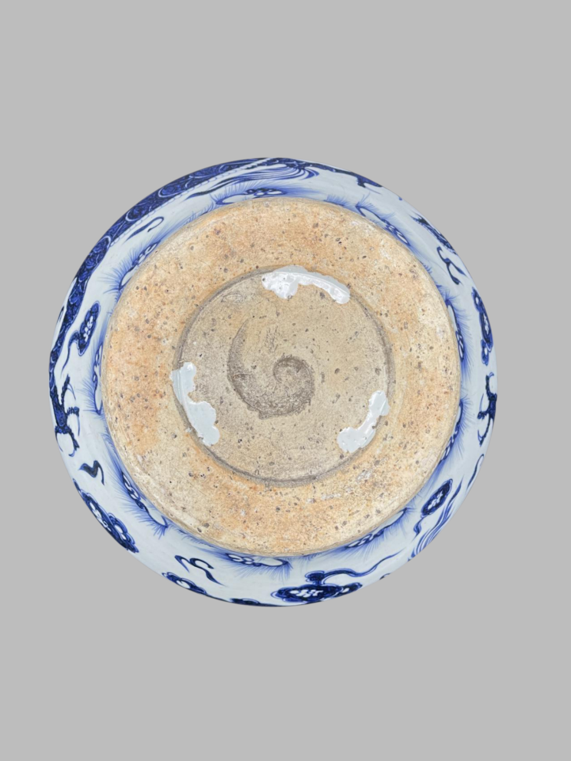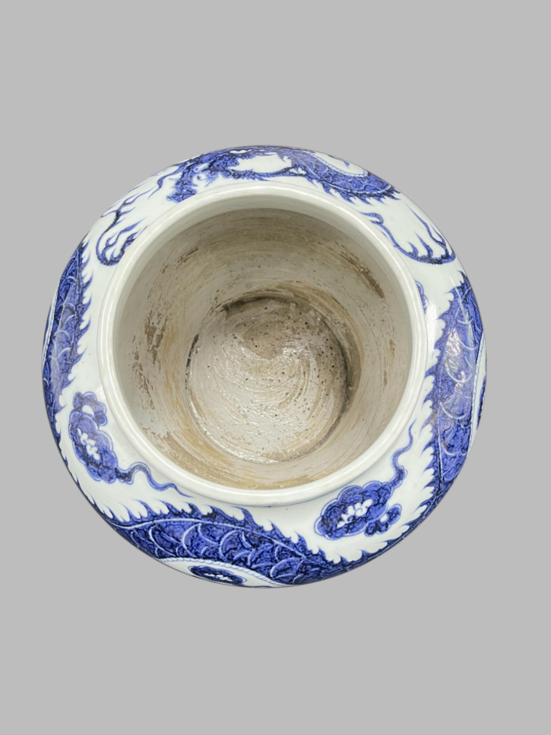 Porcelain Introduction: the vessel has a full and heavy shape with a solid body, conforming to the rugged style of large-sized artifacts from the Yuan Dynasty. The bottom is an unglazed sandy base, where particles of the clay and spiral marks from trimming can be seen, which are typical features of Yuan Dynasty artifacts. The body is decorated with blue-and-white patterns, with the main design being cloud-dragon patterns: the dragon is vigorous and powerful, with strong and forceful claws and dense scales, accompanied by flowing cloud patterns, exuding a majestic aura. The blue-and-white color is rich and bright, the white glaze is lustrous with a hint of blue, and the patterns have rich layers, embodying the artistic characteristic of "full decorative work" of the Yuan Dynasty. This jar not only represents the pinnacle of porcelain-making technology at that time (firing large-sized artifacts required overcoming difficulties such as body deformation) but also carries the symbolic meaning of imperial power in the Yuan Dynasty through the cloud-dragon patterns.
