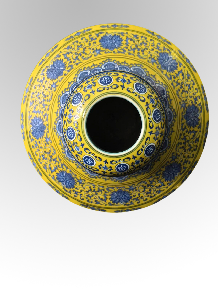 Artistic height:the firing of such porcelain strictly followed court regulations. Every process, from material selection, billet making, glazing to painting, was meticulously controlled by craftsmen from imperial kilns, and imitation by the people was strictly prohibited. The rarity of its existing pieces and the exquisite craftsmanship further highlight the noble status of the holder. It represents the peak level of Qianlong imperial kilns. The combination of the luxurious yellow glaze and the elegant blue and white fully demonstrates the aesthetic style of the "Kangxi-Qianlong Flourishing Age".