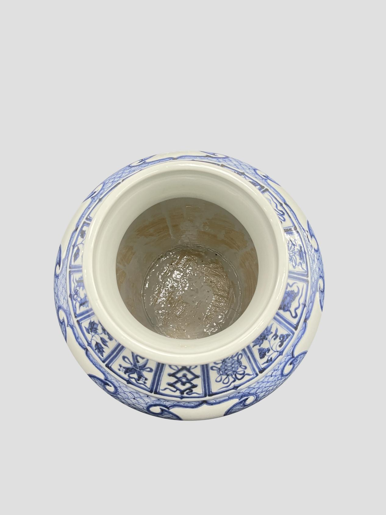 瓷器简介:瓷型硕大,器型饱满,口沿规整、颈部微收、溜肩、腹部圆润,底部稍敛,沉稳之感。通体用青花描绘纹饰,纹饰间用弦纹相隔,为器物增添了层次感。口延处绘蔓草纹一周,寓意“坚韧不拔,生生不惜”;颈部绘海水卷浪纹,有浪涛席卷四方之威,寓意“乘风破浪,事业通达”;肩部绘覆莲纹,莲纹内绘杂宝纹,象征“珍宝满堂,富贵吉祥”;腹部分上下两层描绘纹饰,上腹绘云肩纹,云肩内绘海浪纹与瑞兽纹(如鹿、羊等),瑞兽在海浪纹的衬托下,显得更加灵动,而“鹿”与“禄”谐音,寓意:福禄双全,长寿安康,“羊”与“祥”谐音,寓意:吉祥如意,三羊开泰; 下腹绘双龙纹,龙身矫健,龙爪刚劲,龙纹周围辅以云纹,展现出龙的威严与气势,是青花龙纹的典型风格,体现了当代帝王对龙的崇拜和皇权的象征。