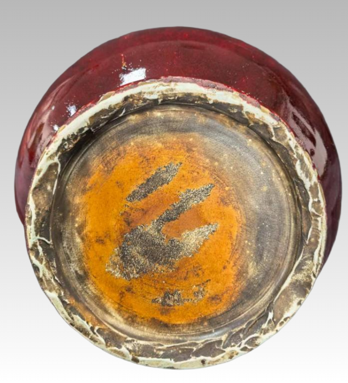 瓷器简介:线条韵律,颈部纤细,口沿呈黄白相间釉色,与主体红釉鲜明。腹部饱满圆润,端庄典雅。属红釉瓷,釉面呈浓郁红调,釉色自然流淌,似红霞漫卷,又若朱砂凝韵,釉面光泽莹润,“明如镜、润如玉、赤如血”在光线映衬下尽显华贵,是单色釉瓷器中的“郎红 ”
