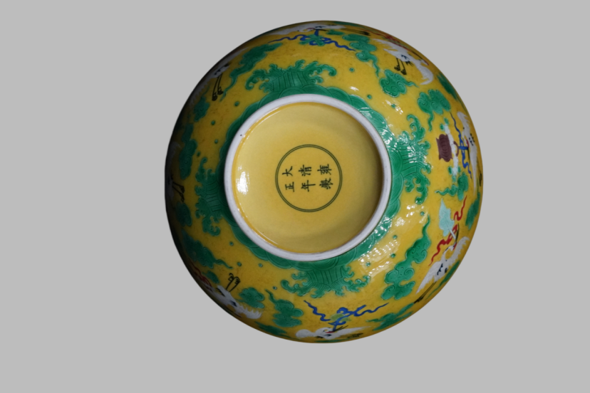 这件是清雍正黄地粉彩仙鹤纹碗,雍正朝是粉彩瓷的"成熟巅峰期”,敞口深腹圈足碗,器型线条柔美、比例协调(雍正瓷的标志性“秀雅”器型);胎体为“糯米胎”,细腻洁白(迎光透影);釉面是 “柠檬黄地”(雍正黄釉发色均匀莹润,为宫廷专用色)。雍正粉彩工艺的标杆:黄地粉彩是雍正朝创新的复合工艺,此碗是 "淡雅精致”风格的典型代表,奠定了后世粉彩的审美基调。