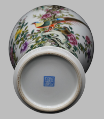 纹饰:以花鸟为主题,孔雀是吉祥象征(寓意富贵、长寿),搭配花卉、山石,营造自然生动画面,符合清代粉彩瓷“图必有意,意必吉祥”的装饰习惯。Centered on flower-and-bird motifs. The peacock, as an emblem of auspiciousness, symbolizes "prosperity and longevity." It is paired with flowers and rockery to create a vivid, nature-inspired scene — conforming to the decorative tradition of Qing Dynasty famille rose porcelain, which holds that "every design carries a meaning, and every meaning embodies auspiciousness."