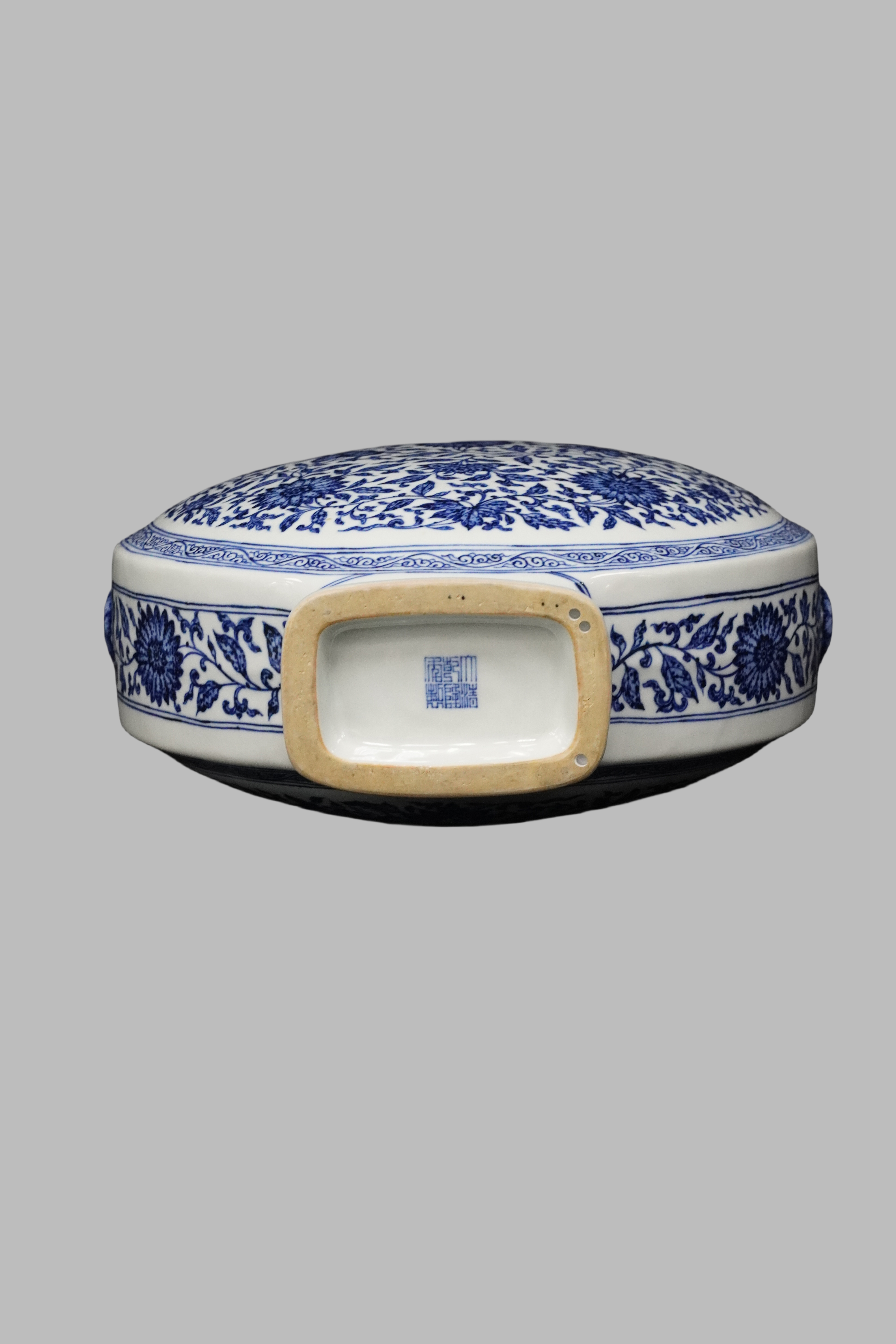 Blue-and-white flat vase with interlocking floral patterns and double ruyi handles, Qianlong reign of the Qing Dynasty.This is a typical imperial kiln display vessel embodying the "emulating antiquity with innovation" style of the Qianlong reign. The imperial kiln body is delicate and dense (known as "glutinous rice paste-like clay"), and the glaze surface is bright white and smooth with a pure white glaze ground.Benchmark of Qianlong's emulating antiquity with innovation: this flat vase not only imitates the shape of the Yongle blue-and-white flat vase but also innovates the decoration with the Qianlong-era "full-body interlocking floral patterns." It embodies the Qing Dynasty's porcelain-making philosophy of "emulating antiquity without being constrained by it."