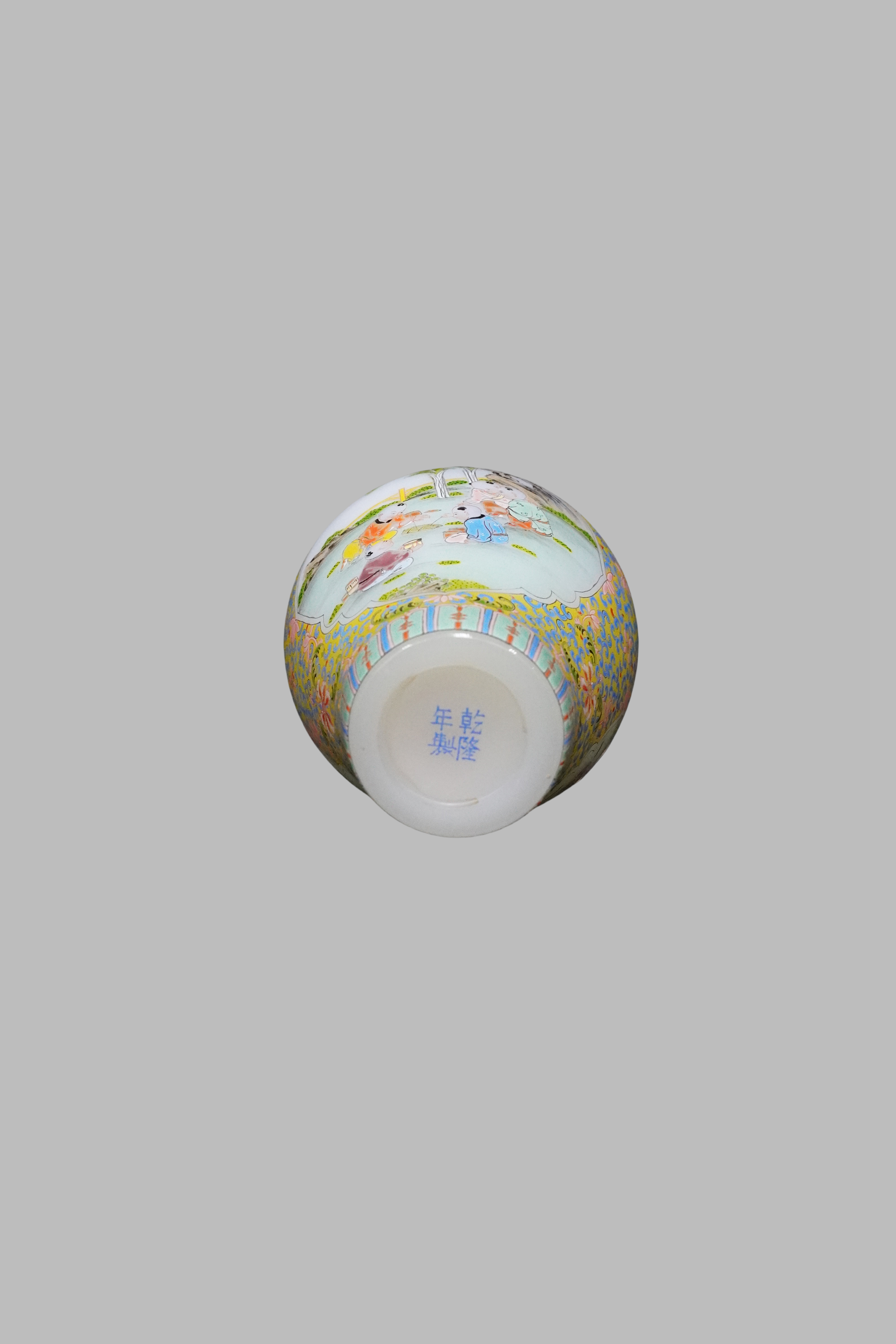 This porcelain piece is a long-necked vase with famille rose glaze, yadao (trailed grain) decoration, reserve panels, and child-play motifs, bearing the Qianlong reign mark of the Qing Dynasty. The reign mark reads "Da Qing Qianlong Nian Zhi" (Made in the Qianlong Reign of the Great Qing Dynasty), and its style corresponds to the Qianlong period of the Qing Dynasty (or it may be a later imitation).The Qianlong era marked the heyday of famille rose porcelain craftsmanship in the Qing Dynasty, with a particular expertise in the intricate decorative style combining "yadao" and "reserve panels." This vase embodies the "exuberant and magnificent" imperial aesthetic of the Qianlong period and stands as a typical representative of the "adding flowers to brocade" technique in Qing Dynasty famille rose porcelain.Child-play motifs are traditional auspicious decorative patterns; when combined with the imperial-exclusive yellow ground, they reflect the Qing Dynasty imperial court's pursuit of auspicious implications such as "prosperity with many children."