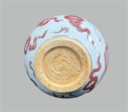 It adopts the underglaze red technique — pigments made of copper red are painted on the porcelain body, which is then covered with a transparent glaze and fired at high temperatures. The color presents the typical Yuan Dynasty characteristic of "red with a purple tint / blurring" (due to limitations in firing technology at that time, it was difficult to precisely control the color development of copper red pigments).