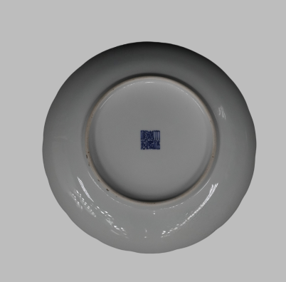 It is a shallow flower-mouth dish (with a petal-shaped rim), a popular decorative form during the Jiaqing reign. The body is fine and pure white — Jiaqing porcelain inherited the glaze and body quality of the Qianlong reign but was slightly less exquisite.