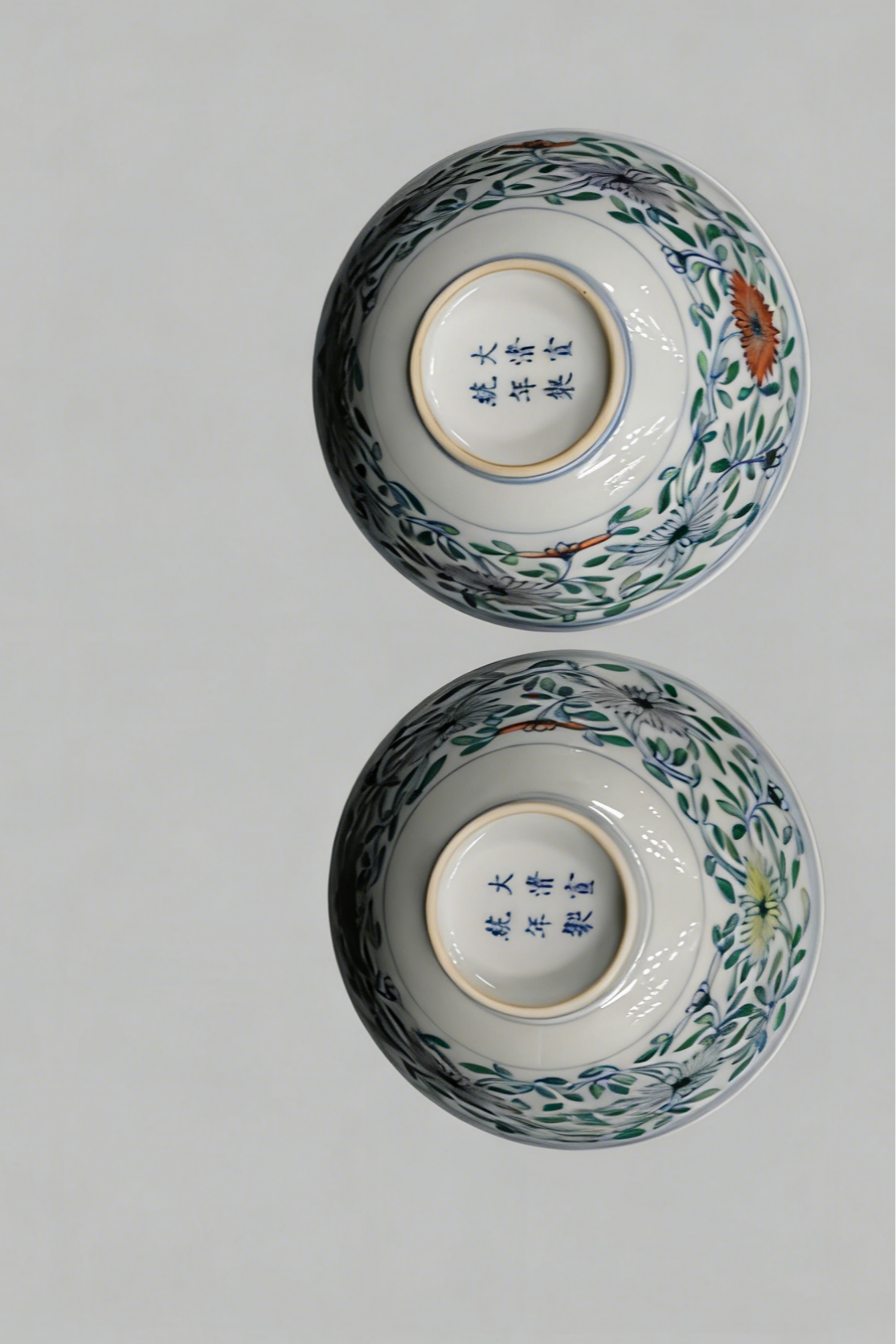 这件瓷器是缠枝菊纹盖碗(一对),器型:标准的(盖为天、碗为人、“三才盖碗”底为地),是清代至民国主流的茶具器型,碗身敞口、深腹、圈足,盖与碗口严合。工艺:采用青花加彩(或五彩)工艺,以青花勾勒菊花轮廓,再填绘绿、黄、红等色彩,属于“细路民窑” 工艺(胎质洁白、釉面莹润,线条流畅)。