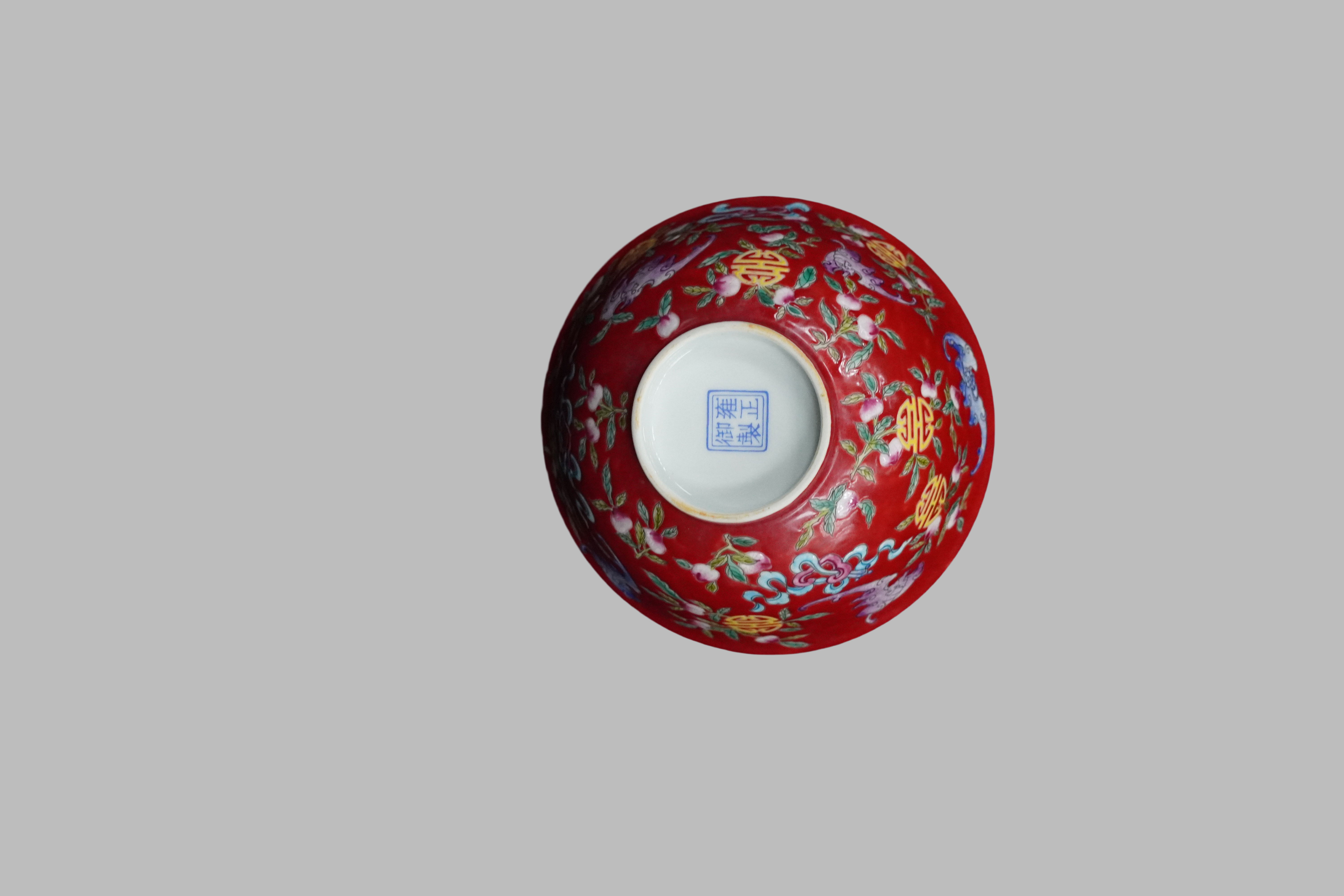 清雍正时期的"胭脂红地粉彩福寿纹碗”是雍正朝官窑精品。以“金红釉”(含微量黄金的低温釉)为地,釉色浓艳如胭脂,是雍正官窑标志性名贵釉色;在胭脂红地上用粉彩(玻璃白打底+多层渲染)绘制纹饰,色彩柔和且有细腻渐变,符合雍正粉彩“清逸艳丽”的风格;胎体细薄坚致(“糯米胎”),白釉莹润如羊脂玉,是雍正官窑“白如玉、薄如纸” 的典型特征。融合了雍正朝最名贵的胭脂红釉与巅峰粉彩工艺,纹饰吉祥且工艺精湛,是清代彩瓷艺术的代表作之一。