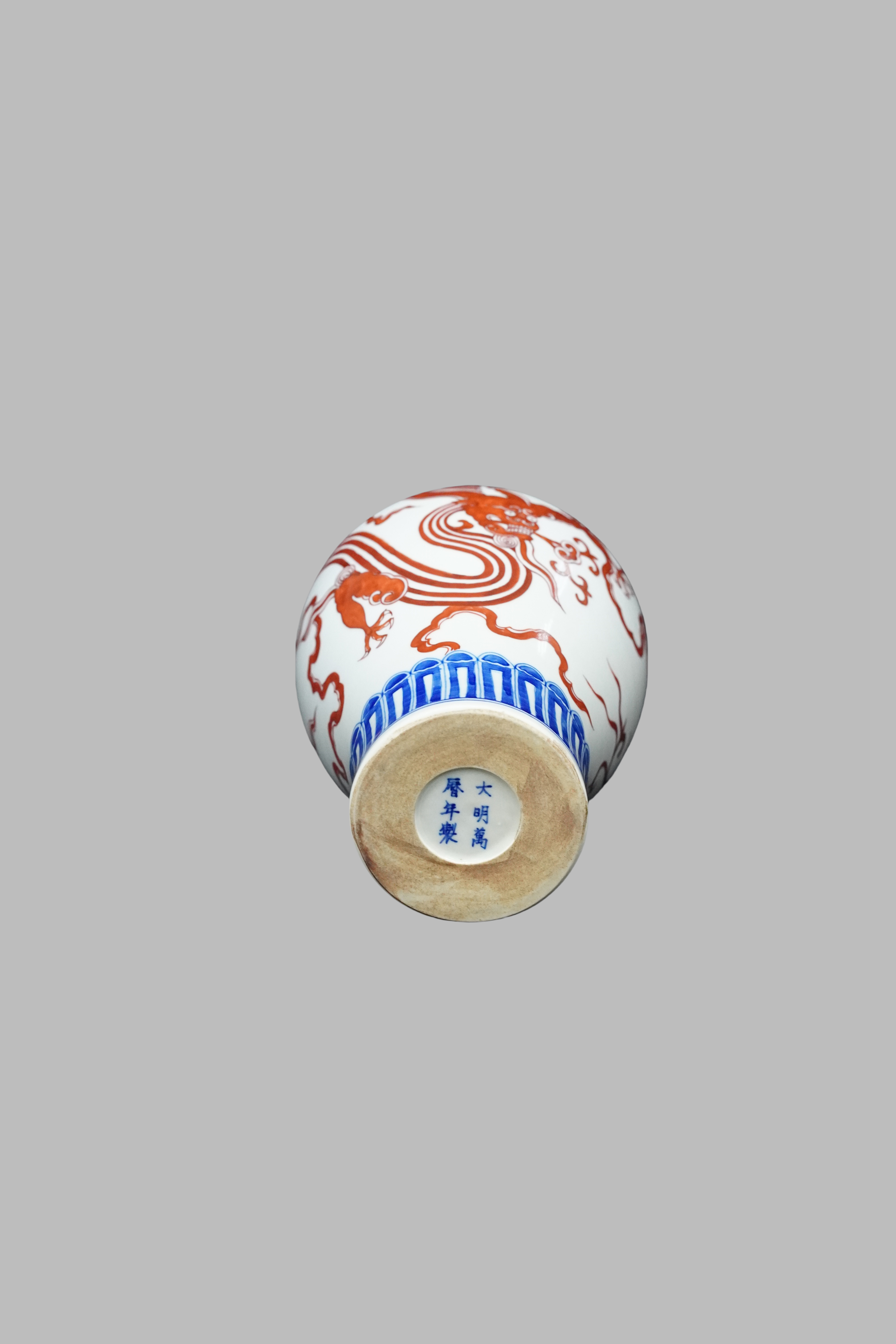 Centered on the core technique of "underglaze blue outlining border decorations + iron red painting dragon motifs," it represents the popular "blue-and-white iron red glazed" craftsmanship in the early Qing Dynasty (Kangxi and Yongzheng reigns). The underglaze blue exhibits a rich and stable hue (characteristic of Kangxi's "emerald blue"), while the iron red glaze features a bright color (Yongzheng's iron red is more delicate). As a high-quality category of imperial kilns in the early Qing Dynasty, intact plum vases with dragon motifs are relatively scarce. It is a rare treasure in the world.