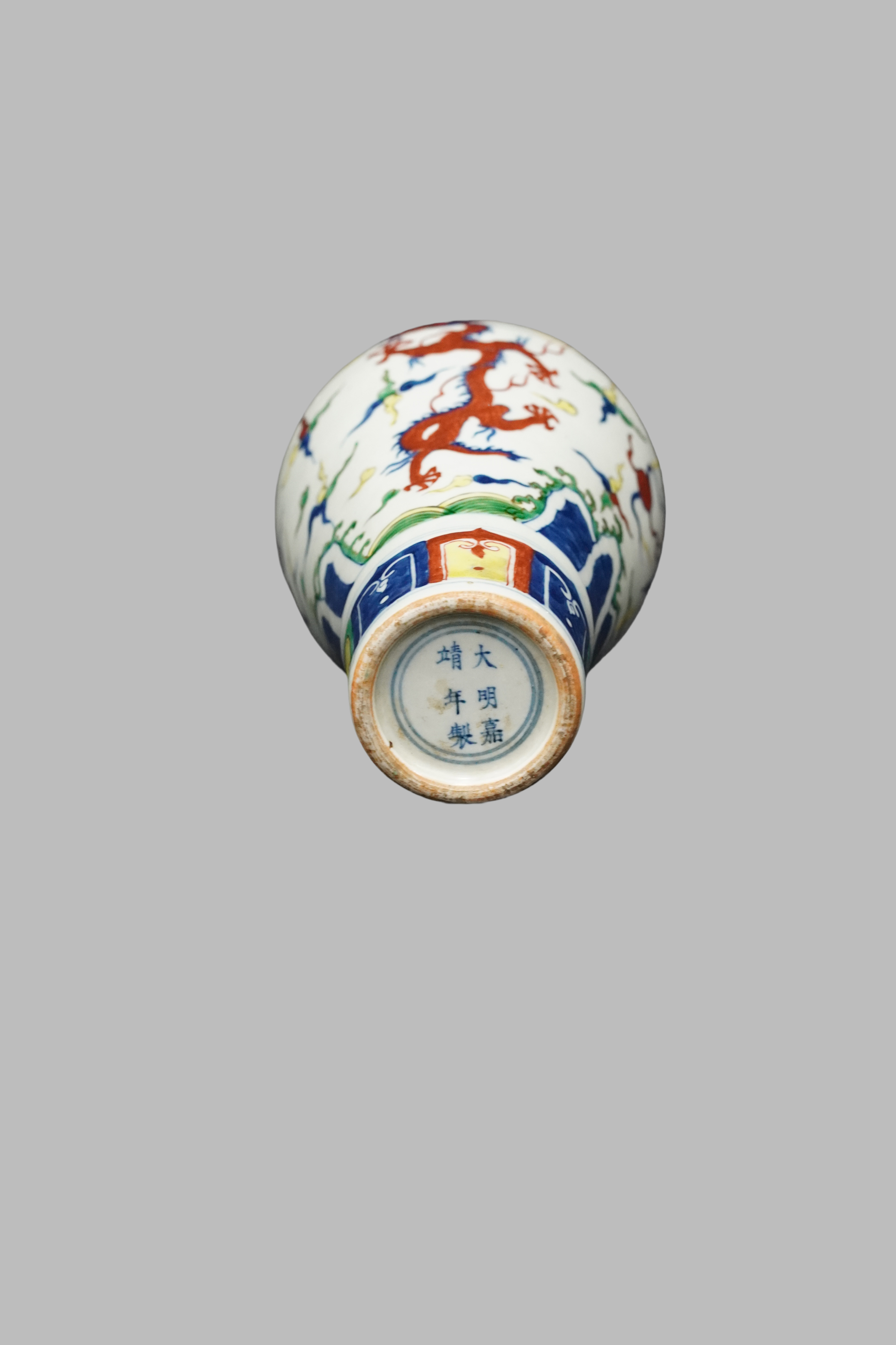 明嘉靖时期的青花五彩龙纹梅瓶,是万历五彩工艺的标杆,回青料青花与五彩搭配、倭角成型等工艺,展现了明代晚期制瓷的最高水平;历史价值上,龙纹、官窑款识印证了宫廷用瓷制度,为研究万历朝手工业管理、皇权象征体系提供实物;收藏价值上,完整真品存世量少,尤其带镂空、精细绘画工艺的品类,是高端古董瓷收藏市场的核心藏品。