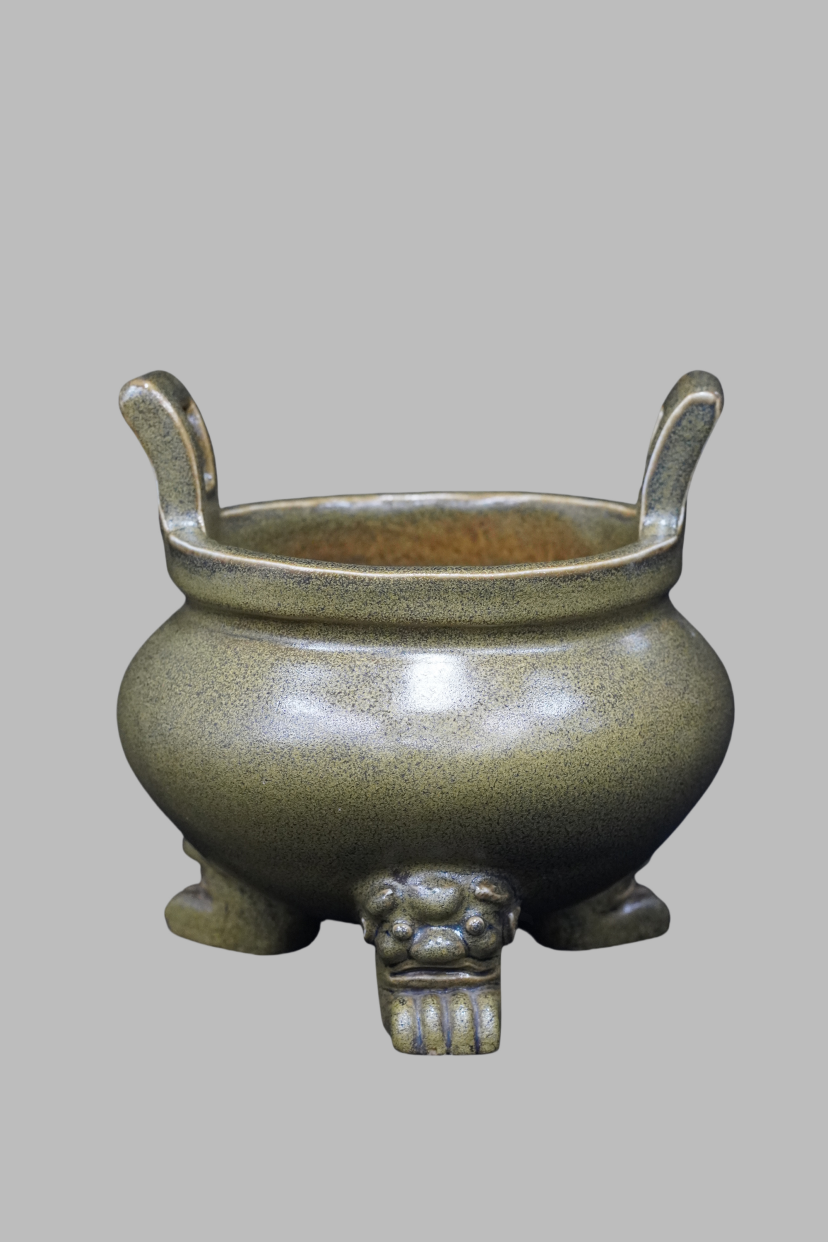 Tea-dust glazed three-legged censer with double ears, Qing Dynasty(1636-1912)