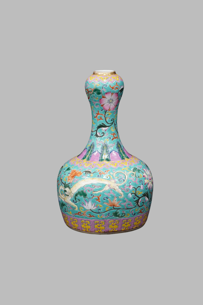 Famille rose garlic-shaped vase with auspicious beast patterns on green ground, Guangxu Qing Dynasty(1875-1908)