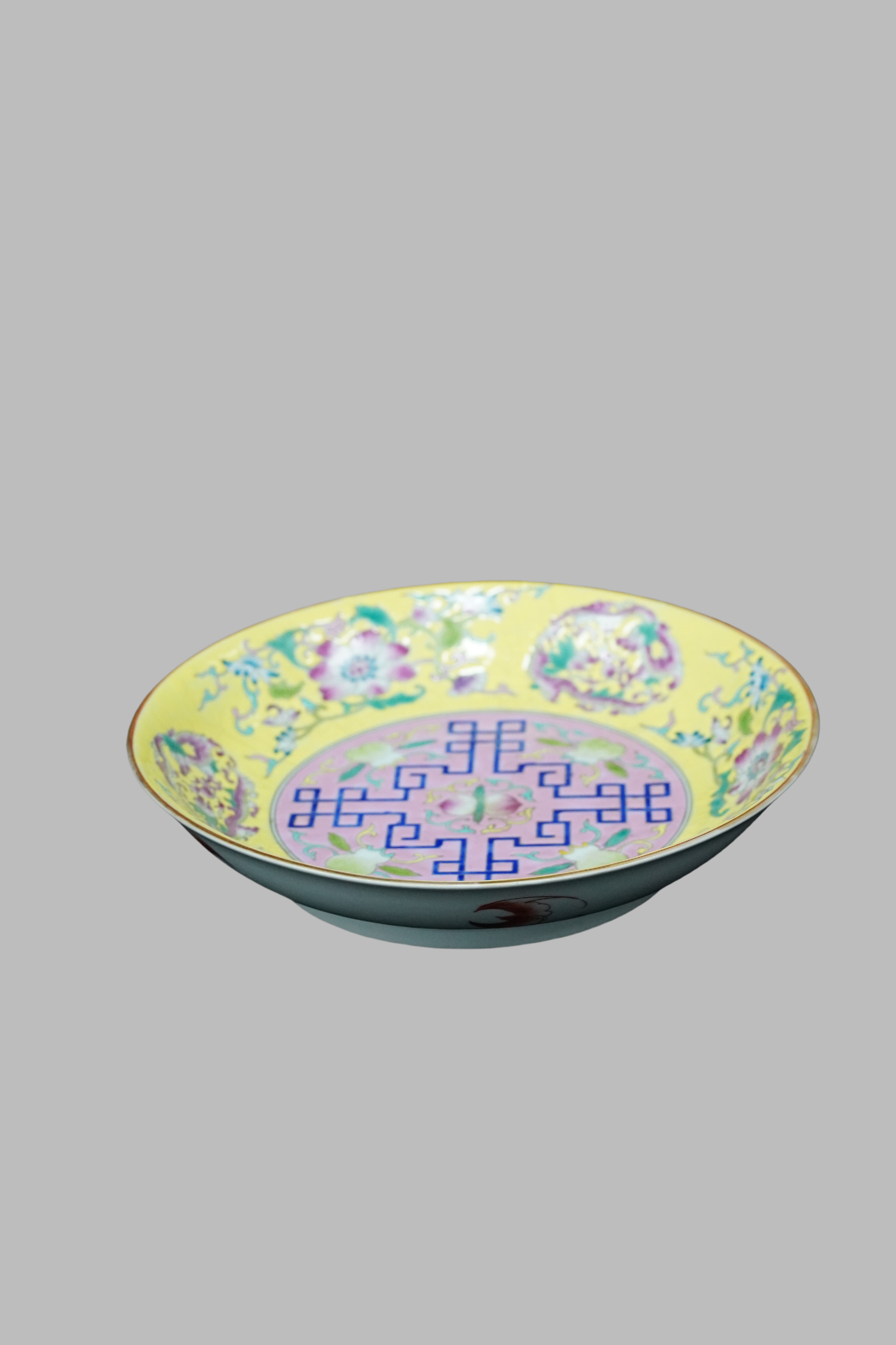 Famille rose plate with floral patterns on yellow ground, Yongzheng Qing Dynasty(1723-1735)