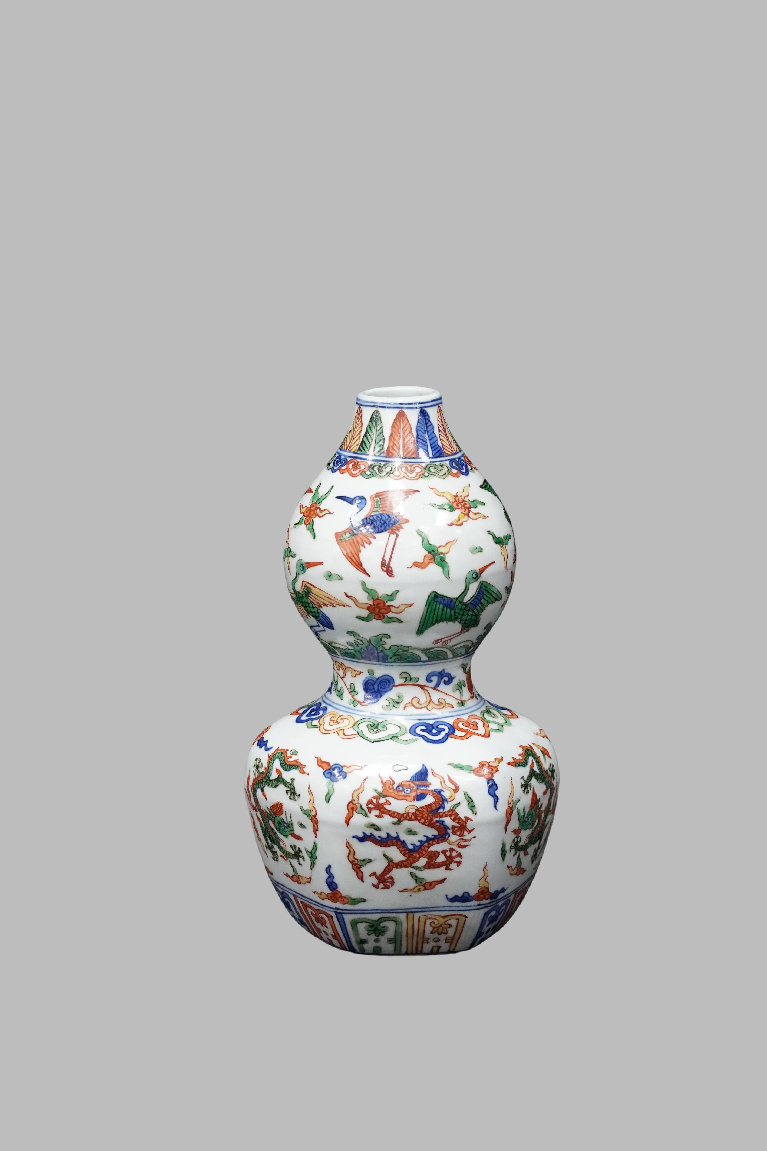 Blue and white wucai (five-color) double-gourd vase with dragon, phoenix, and crane patterns, Jiajing period, Ming Dynasty(1522-1566)