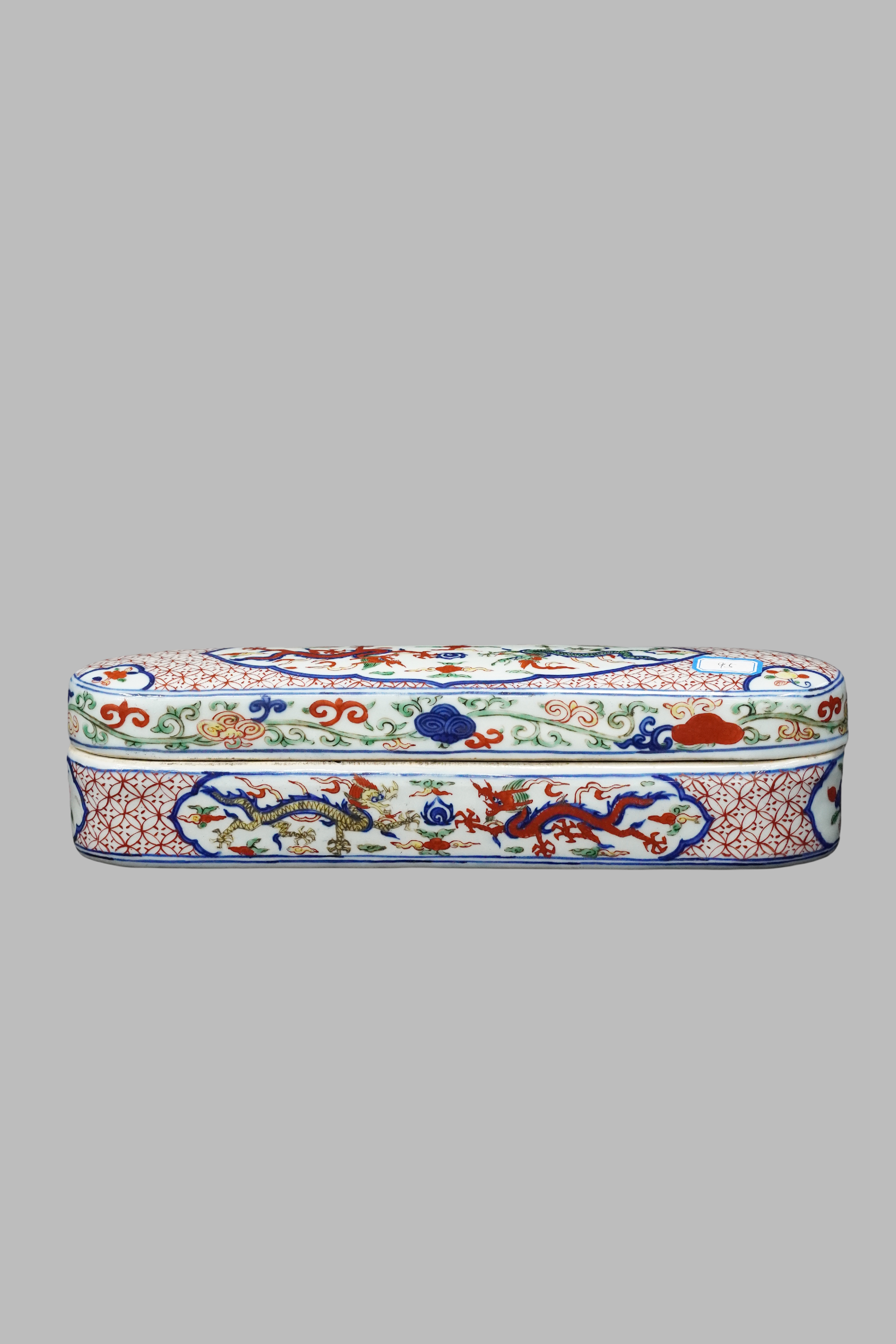 Wucai (five-color) square box with dragon pattern and low corners, Wanli Ming Dynasty(1573-1620)