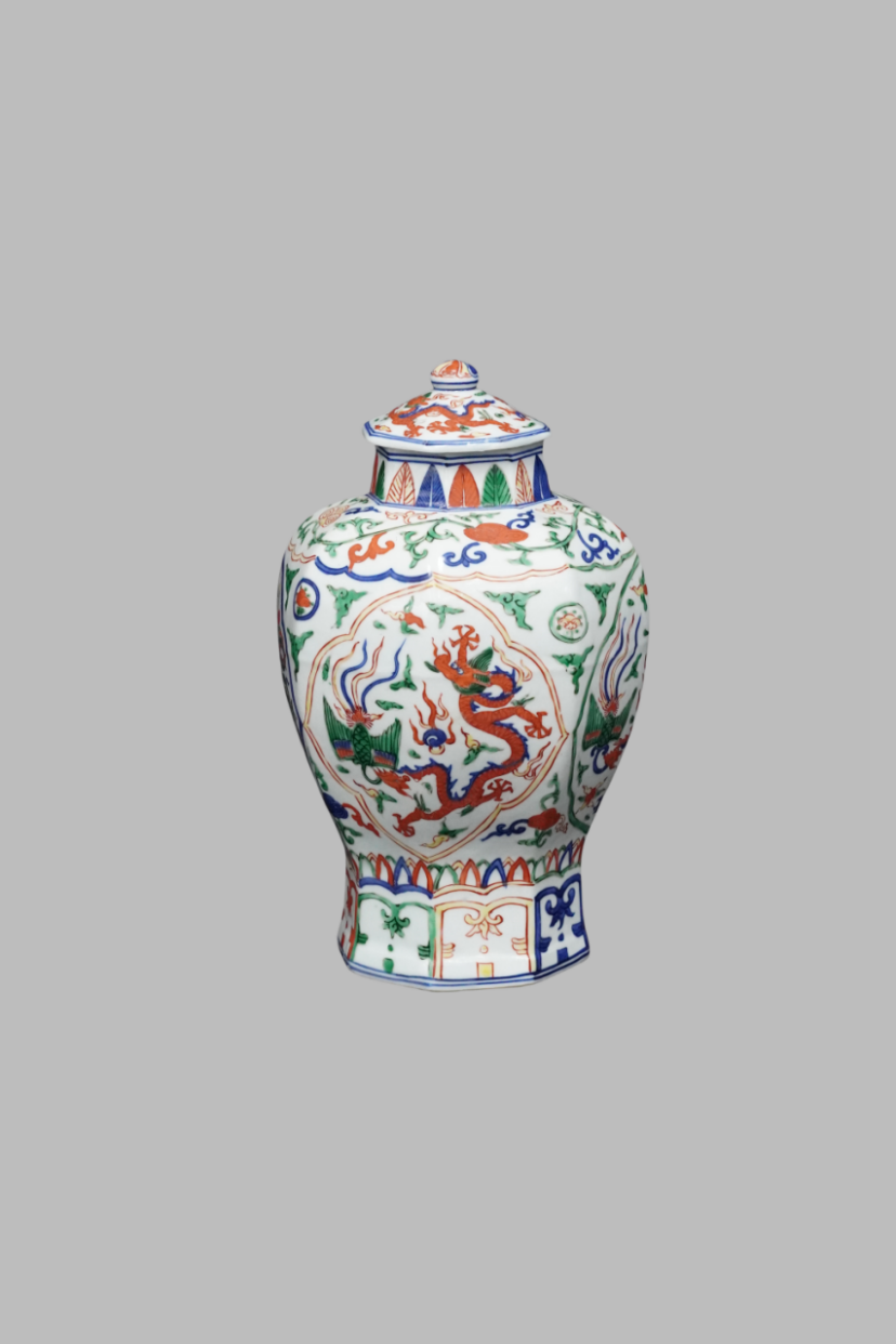 Wucai (five-color) covered jar with dragon pattern, Jiajing period, Ming Dynasty(1522-1566)