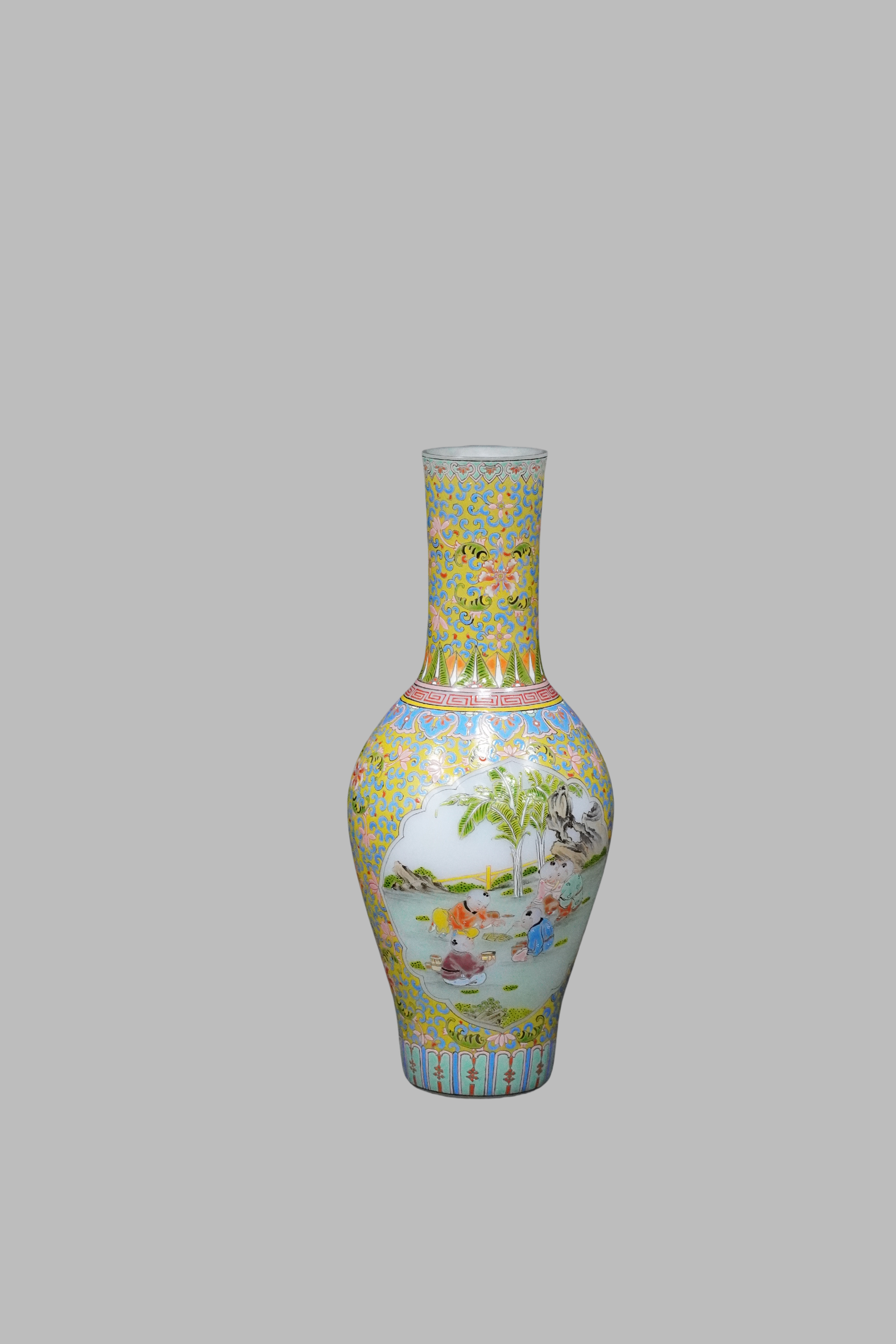 Yellow-ground yadao famille rose long-necked vase with reserved panels depicting children at play, bearing a Qianlong reign mark, Qianlong Qing Dynasty(1736-1795)